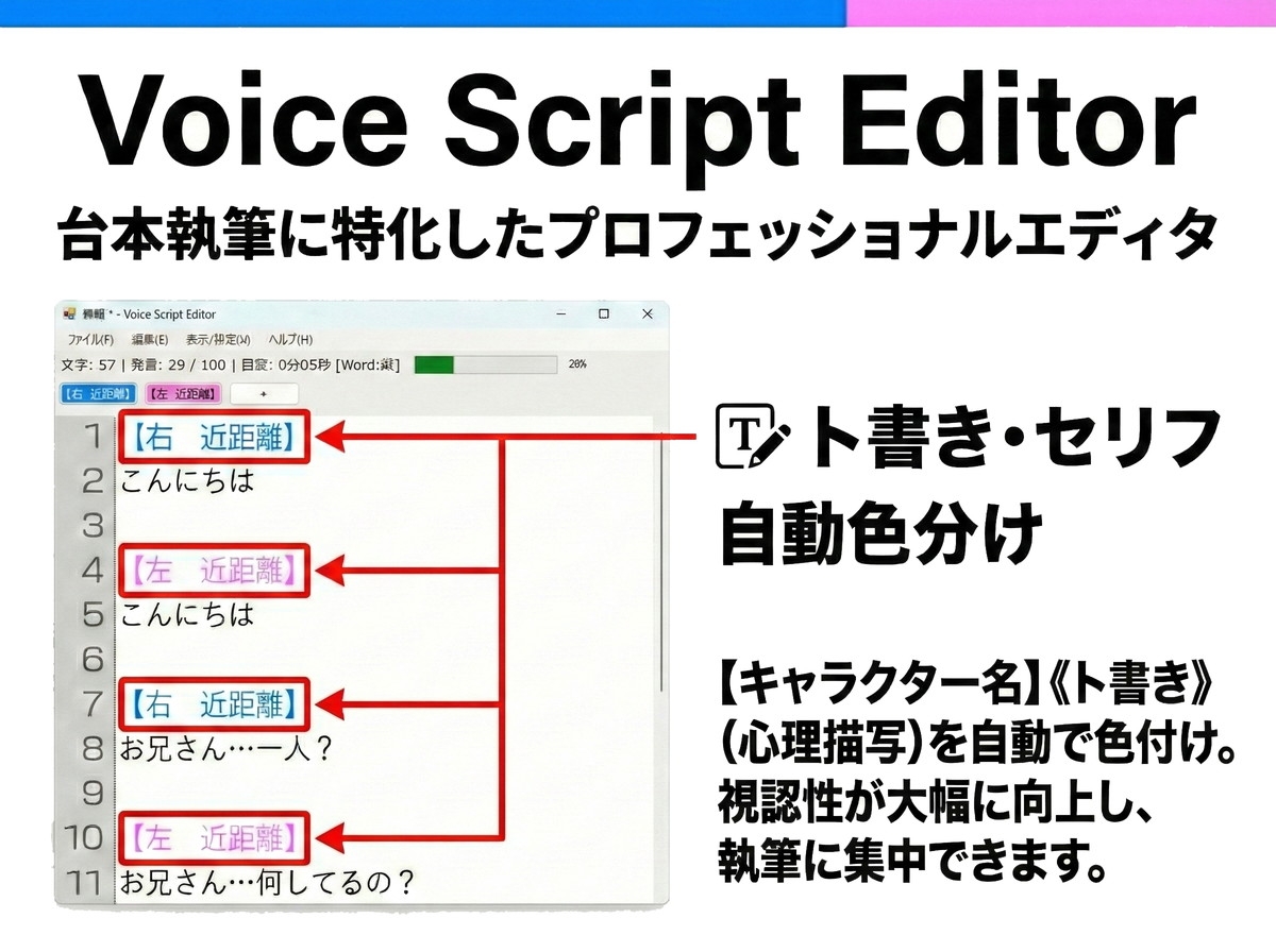 : | 【執筆効率化】書くだけで「尺」が見える!ボイス台本専用エディタ【Voice Script Editor】 |